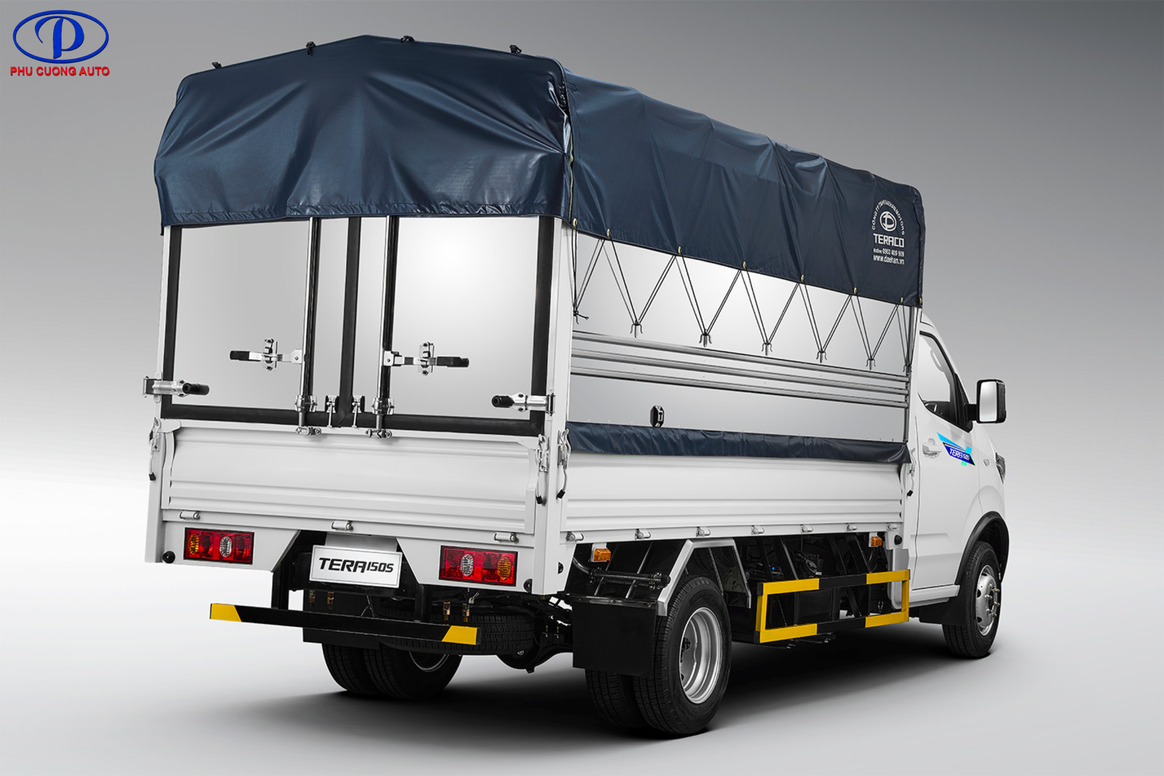 Đuôi xe của Tera 150S thùng bạt được thiết kế vuông vức để tối ưu hóa không gian thùng hàng. Thiết kế này giúp tăng diện tích chứa hàng, cho phép vận chuyển được nhiều loại hàng hóa khác nhau. Thùng bạt được làm từ vật liệu chắc chắn, chịu tải tốt và đảm bảo an toàn cho hàng hóa trong quá trình vận chuyển.